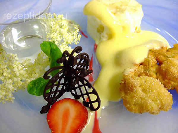 Gebackene Holunderblüte mit Parfait und Holunderessenz