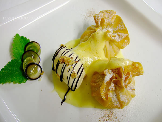 Ziehteig-Traubensäckchen mit Zimteis und Weißweinsabayon