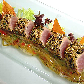 - Spießchen von Jakobsmuscheln in Tempura gebacken auf Gemüsekuskus und Hummerschaum
