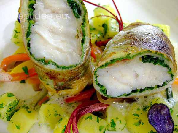 ZUBEREITUNG DER FISCHROLLEN IM BAUCHSPECK-WIRSINGMANTEL