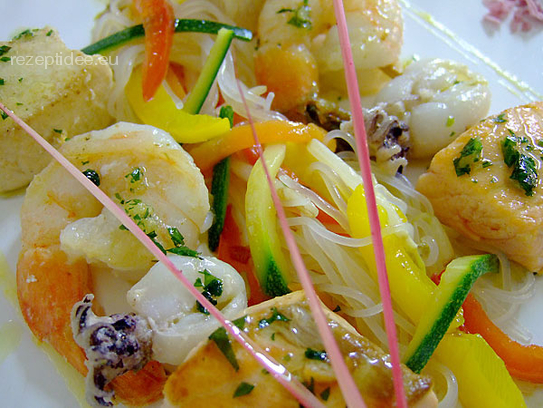 Wasser in einem Topf zum Kochen bringen, salzen und die Gemüsestreifen kurz blanchieren. Das Gemüse abseihen und in Eiswasser abkühlen. Das Gemüsewasser beiseite stellen und die Glasnudeln 6 – 8 Minuten darin ziehen lassen (nicht kochen). Die Nudeln abseihen und unter kalten Wasser abschrecken. Die Glasnudeln mit den Gemüsestreifen, der scharfen Chilisauce, Salz und Pfeffer verrühren und abschmecken.