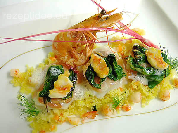 Saltimbocca von der Scholle mit Rohschinken, Blattspinat und Riesengarnelen auf Gemüsekuskus