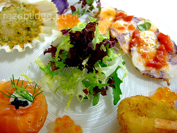 Die Garnelenschwänze können Sie auch mit einem Tempura-Backteig frittieren. Die Jakobsmuscheln schmecken auch gratiniert mit etwas Weißbrotbrösel vermischter Hollandaise-Sauce, oder in Lardo eingewickelt und gebraten. Den Oktopus schneiden Sie nach dem Kochen in Würfel und bereiten diesen mit Knoblauch, Tomatenwürfel, Sellerie, Lauch, Olivenöl, Weißweinessig, Limetten-Saft, Paprikapulver, Salz und Pfeffer als lauwarmen Salat zu.