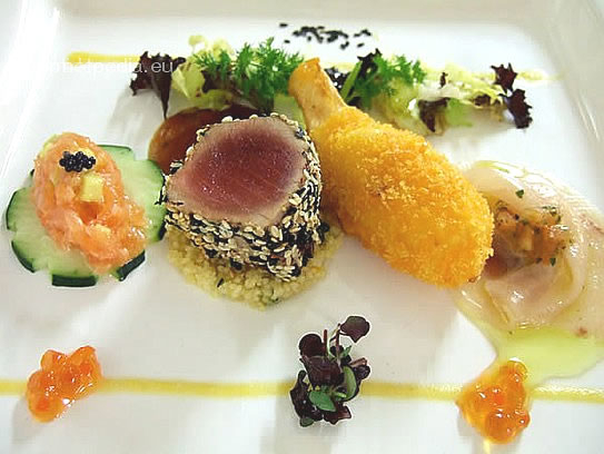 Variation von Lachstartar, Thunfisch in Sesamkruste, frittierte Krebszangen und Schwertfischcarpaccio