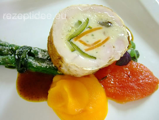 Truthahnrolle mit Zucchini und Karotten auf Spargelbündchen
