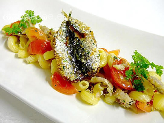 Den frischen Sardellen den Kopf abtrennen, die Rückengräte mit den Innereien herausziehen und unter fließenden kalten Wasser säubern. Die Sardellenfilets mit Küchenkrepp abtupfen und in Stücke schneiden. Die Kirschtomaten waschen und vierteln. Die Knoblauchzehen schälen, den Kern raustrennen und den Knoblauch klein hacken. Das Olivenöl in einer Pfanne erwärmen, den Knoblauch darin anschwitzen und die geschnittenen Sardellenfilets darin sautieren. Die Kirschtomaten dazu geben, kurz mitschwenken und mit Salz und Pfeffer würzen.