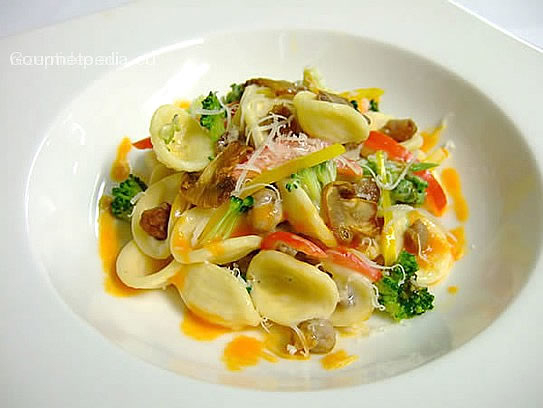 Orecchiette Nudeln mit Bratwurst, Brokkoli, Paprikaschoten und Champignon