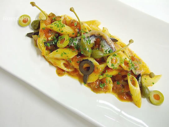Penne mit Tomaten, Oliven, Sardellen und Kapern