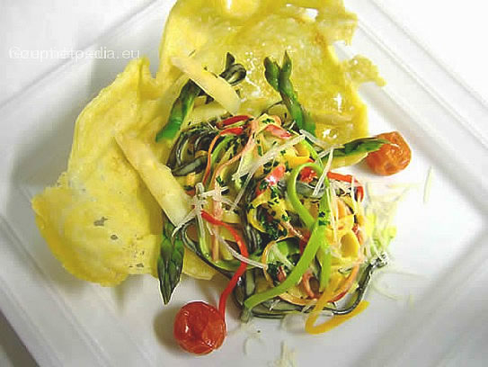 Das Gemüse waschen, die Karotte schälen, alles in dünne Streifen schneiden und beiseite stellen. Das Wasser mit Salz, etwas Butter und einige Spritzer Zitronensaft zum Kochen bringen. Die Spargel schälen, die holzigen Enden abschneiden und in dem Wasser für zehn Minuten kochen. Schneiden Sie die Spitzen ab und legen sie für die Garnitur beiseite. Jetzt schneiden Sie die Spargelstangen ebenfalls in dünne Streifen für die Sauce. Das Spargelwasser und die Sahne erhitzen Sie in einer Pfanne, lassen die Flüssigkeit auf ca.300mL einkochen, schmecken sie mit Salz und Pfeffer ab und binden sie leicht mit der in Wasser aufgelösten Speisestärke ab.