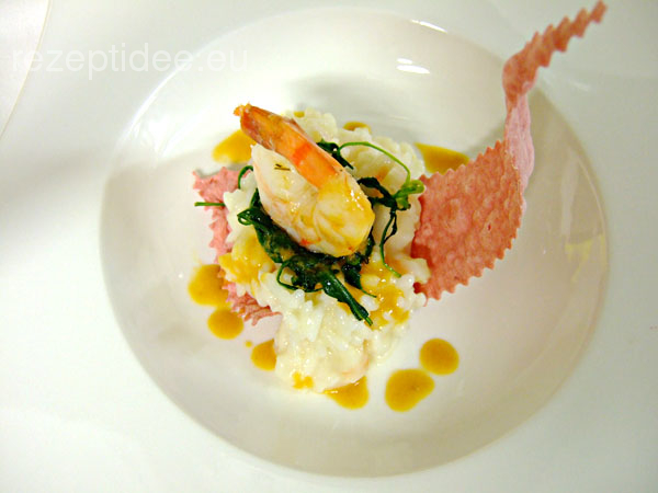 Risotto mit gebratenen Riesengarnelen und gedünsteten Mangoldblättern
