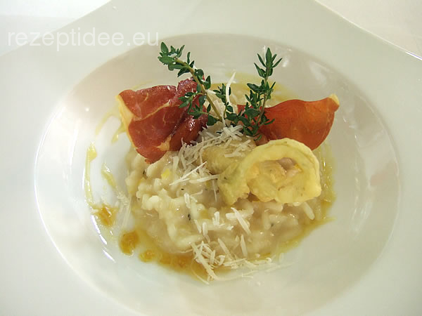- Risotto mit Zitrone und Thymian, Artischocke in Tempura und Rohschinkenchips