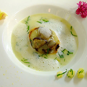 • Bergblütenschaumsuppe mit Ziegenfrischkäse auf Röstbrot
