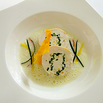 Weiße Bohnencremesuppe mit Perlhuhnrolle