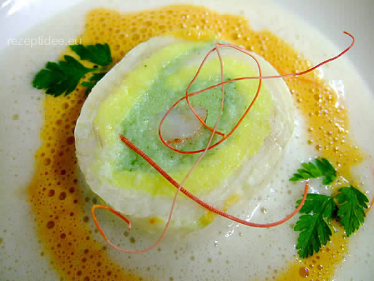 Den Seezungen die Haut abziehen, mit einem scharfen Messer filetieren und die Filets in Würfel für die Farce schneiden. Die Forellen ebenfalls filetieren, die Gräten ziehen und von der Haut abschneiden. Die Forellenfilets zwischen Klarsichtfolien mit dem Plattiereisen leicht klopfen. Die Filets nebeneinander auf Klarsichtfolie legen ca.15 mal 20cm und kühl stellen. Die Seezungenwürfel mit der Sahne im Tiefkühlschrank für 10 Minuten abkühlen und die Spinatblätter kurz blanchieren und abkühlen. Die kalten Seezungenwürfel mit etwas Salz, weißen Pfeffer aus der Mühle, Weißbrot, Eiweiß und der Sahne im Cutter zu einer geschmeidigen Farce mixen. Die Hälfte der Farce vom Cutter nehmen und mit Kurkuma verrühren. Die andere Hälfte mit dem blanchierten Spinat noch mal kurz durch mixen Die Farcen einige Minuten auf Eis rühren, bis diese einen Seidenglanz erhalten. Die Riesengarnelen vom Kopf und Panzer befreien und den Darm herausziehen. Nun die gelbe Farce auf die Seezungenfilets (mit Salz und Pfeffer gewürzt) aufstreichen, dann die grüne Farce darüber streichen und die Garnelenschwänze längs aneinander legen. Vorsichtig den Fisch in der Klarsichtfolie einrollen, die Enden festhalten und die Rolle am Tisch rollen bis diese ganz fest und rund wird. Die Fischrollen für 2 Stunden im Kühlschrank durch ziehen lassen. Die Rolle in Alufolie einrollen und im Dämpfer bei 90 Grad ca.35 Minuten bis Kerntemperatur 60 Grad dämpfen oder im Wasserbad bei 80 Grad gar ziehen lassen. Die Fischrolle 20 Minuten nachziehen lassen und erst kurz vor dem Servieren aus der Folie nehmen.