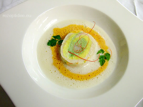 Creme von der Seezunge und Riesengarnele mit pochierter Fischrolle