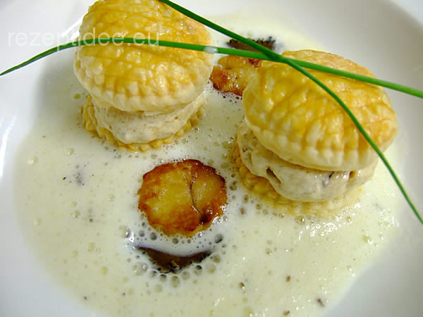 Kartoffellauchschaumsuppe mit schwarzem Trüffel und Blätterteigkissen mit Entenlebermousse