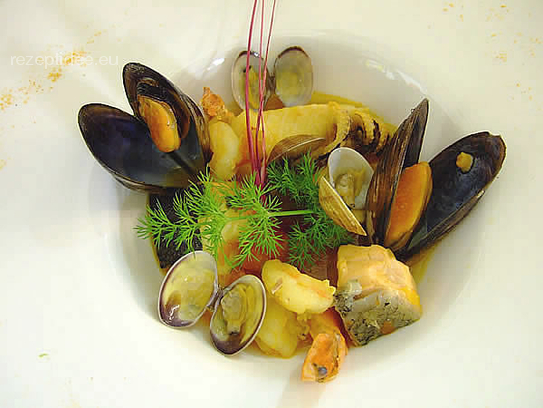 Den Seeteufel und das Zanderfilet in Mundgerechte Stücke schneiden, die Muscheln gut abwaschen und mit einer Bürste oder einem Messer von Krusten befreien, den Garnelen den Panzer bis zum Schwanzende abziehen und den Darm entfernen, die Tintenfische putzen und schneiden.