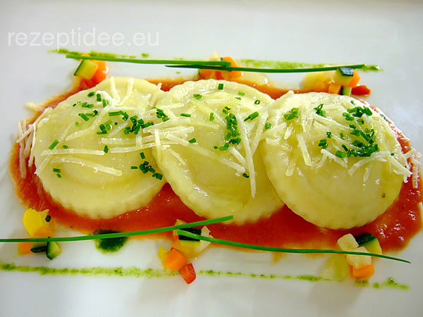 Kartoffelravioli mit Schinken-Lauchfüllung auf Tomatencreme