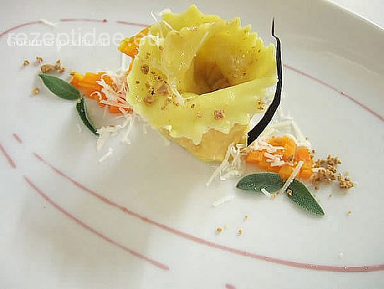 Den Teig mit der Nudelmaschine (oder Rollholz) in 1mm dünne Teigblätter ausrollen und diese mit einen Wellenteigrad in 15cm / 15cm Quadrate schneiden. Beim Ausrollen Hartweizenmehl zum Bestäuben verwenden, damit die Teigblätter nicht an die Tischplatte kleben. Die Kürbisfülle mittels einer Spritztüte in der Mitte der Teigblätter längs aufspritzen und eine Seite der Teigblätter mit verquirlten Ei bestreichen. Nun die Teigenden über die Füllung schlagen, aneinander kleben und zu einer Schnecke aufrollen, mit etwas Ei das Ende der Rolle an die Schnecke drücken. Bis zum Kochen mit einem Tuch abdecken (nicht Klarsichtfolie), und kühl stellen.