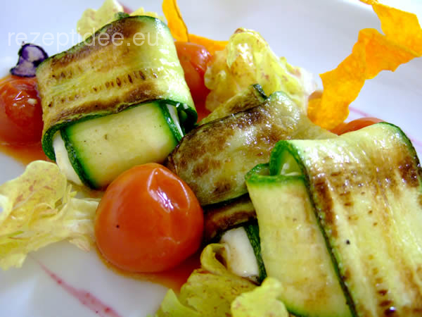 - Zucchiniröllchen gefüllt mit Tomaten, Parmesan und Basilikum auf gratinierten Kartoffeln