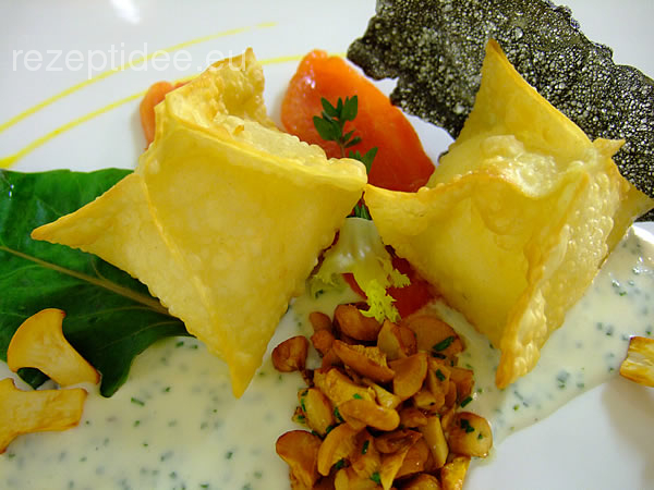 Frittierte Wonton mit Pfifferlingsfülle auf Schnittlauchsauce mit Ofentomaten